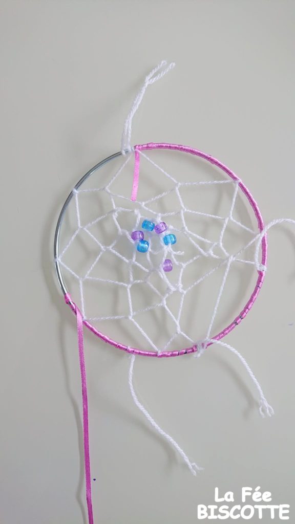 Tu peux ensuite ajouter des perles et des plumes à ton attrape rêve. J’ai tout fixé avec des nœuds.