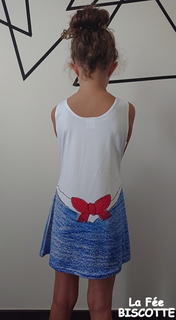 Melle voulait avoir une robe identique à un de ses personnages préférés du moment, Sailor Moon pour ceux qui connaisse 😉 Mais elle ne voulait pas avoir l’avant de la robe dans le dos avec une reproduction similaire. C’est vrai que concrètement ça le fait moyen. Du coup j’ai contacté le SAV et je leur ai demandé si c’était possible. Ils ont gentiment accepté. Pour ça j’ai du juste leur transmettre un nouveau dessin avec le dos de la robe. Et le résultat a été concluant car Melle avait les yeux brillants en découvrant son dessin sur sa nouvelle robe.