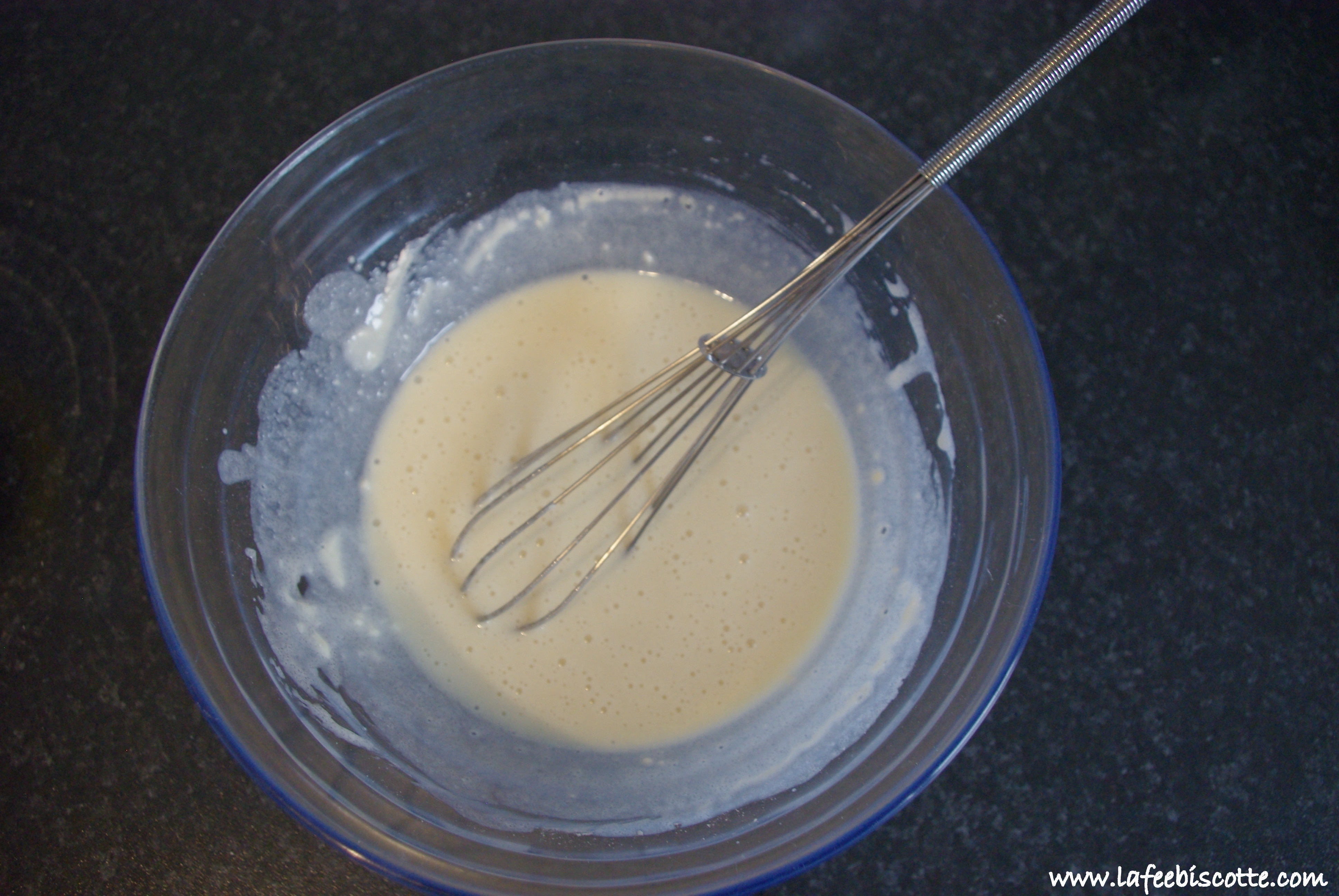 - Mélanger les deux préparation (chocolat fondu et mélange farine + lait)