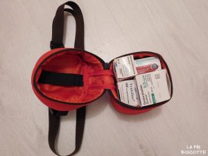 À l’intérieur se trouvent trois bandes élastiques pour maintenir les outils de prise (cuillère, pipette…) et les médicaments. Il y a également un emplacement dédié au rangement de l’ordonnance et du PAI.